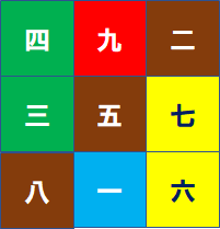 九星については、伝説にて、夏王朝を創始した禹(う、紀元前1900年頃)が洛水を通りかかった時、川の中から飛び出た神亀の甲羅に描かれた模様から、この魔方陣を思いついたとされている。よってこの魔方陣を、洛水の書「洛書」(河図洛書)という。気学(きがく)とは園田真次郎が九星術をベースに1924年に創始した日本生まれの占術である。3×3の魔方陣である洛書から生まれた紫白九星を使って様々な事柄を占い、また移動の方位の吉凶を論じる。
